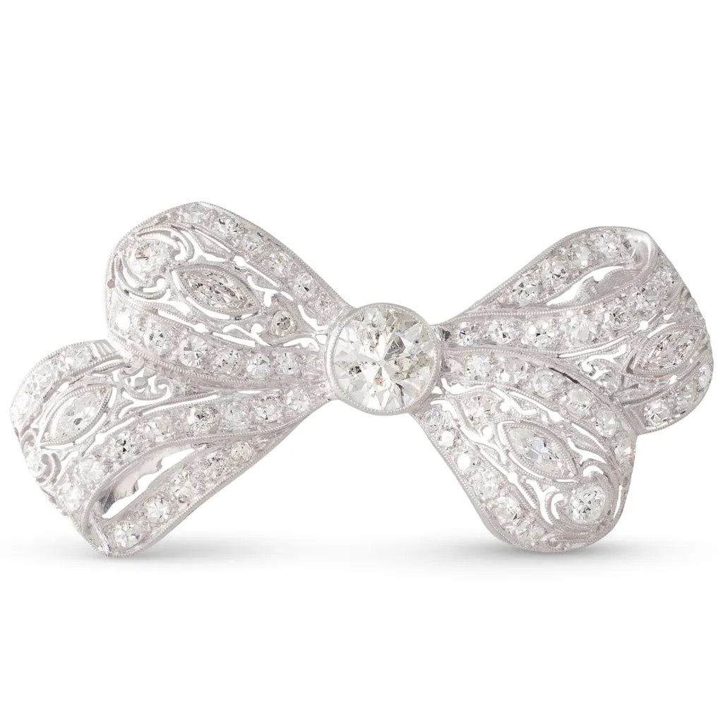 Platinum bow brooch rim set to the centre with a transition cut diamond of estimated weight 1.65ct graded as colour I-J clarity P1 with a marquise cut diamond to each of the four ribbon sections all surrounded by early brilliant and single cut diamonds the brooch fastening with a hinged pin and roller catch.